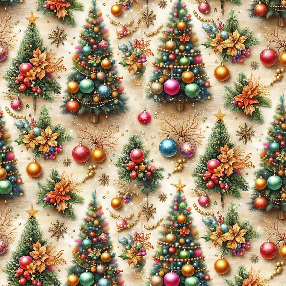 NT26 - TRICOL. COLEÇÃO NATAL BALLS/BELLS/TREES - ÁRVORES FUNDO BEGE - 100% ALGODÃO A4385-001
